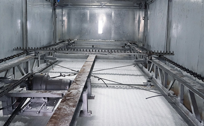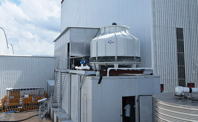 冰勛制冷混凝土冷卻降溫解決方案包含大型片冰機,冰塊生產后通過重力掉入耙冰區(qū),再通過自動耙冰系統(tǒng)將冰塊輸送到攪拌倉,中間配置冷藏儲冰庫用于冰塊的暫存。
