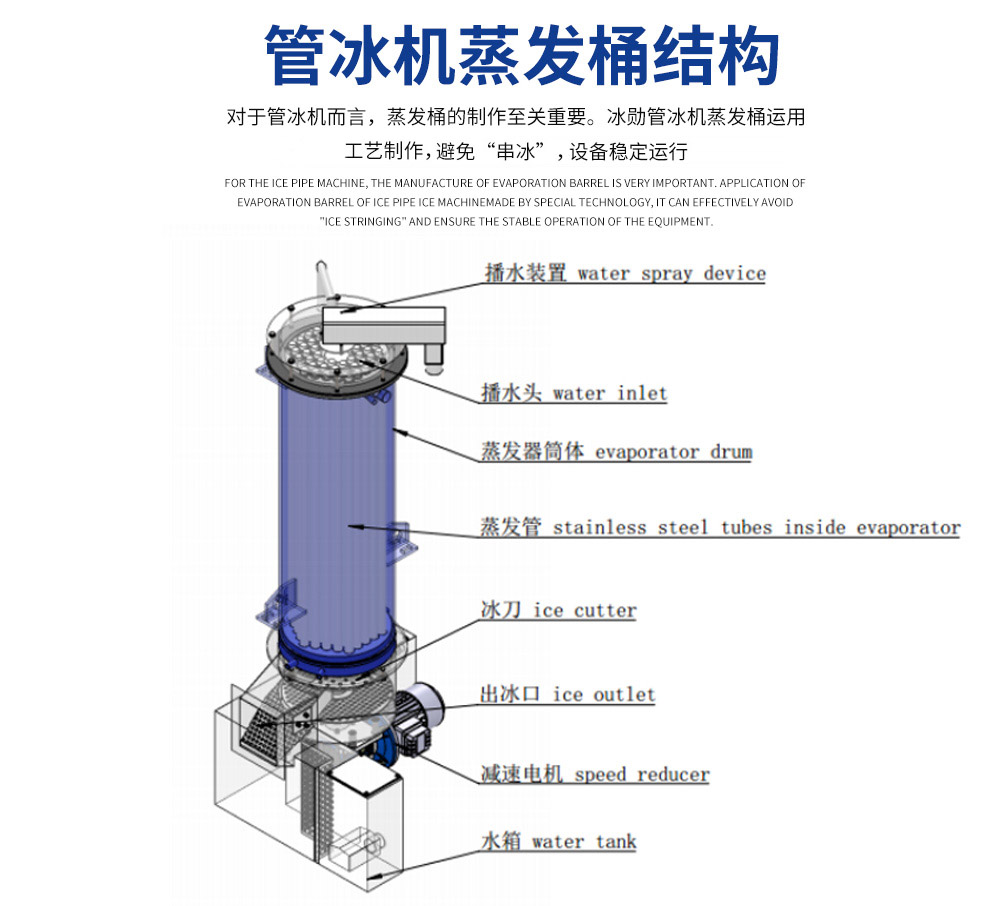 2、管冰機(jī)所有與制冰水接觸部分材質(zhì)均是食用級(jí)材料。 由多根不銹鋼管組成蒸發(fā)器制冷劑在管與管之間流動(dòng),水在管內(nèi)從上往下在分水器的作用下呈螺旋狀流動(dòng), 水在流動(dòng)過(guò)程中形成冰。