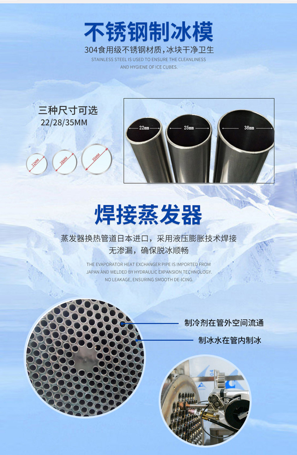 2、管冰機所有與制冰水接觸部分材質(zhì)均是食用級材料。 由多根不銹鋼管組成蒸發(fā)器制冷劑在管與管之間流動,水在管內(nèi)從上往下在分水器的作用下呈螺旋狀流動, 水在流動過程中形成冰。