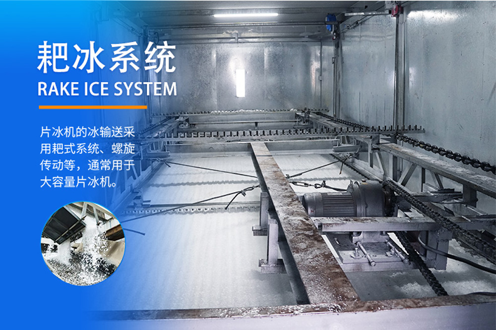 30噸24小時(shí)片冰機(jī)廣泛應(yīng)用于海港魚(yú)類(lèi)冷卻、混凝土加冰降溫等。片冰機(jī)采用立式螺旋切冰蒸發(fā)器。制冰時(shí)水要均勻,通過(guò)分水裝置分布到冰桶內(nèi)壁。該系統(tǒng)由集裝箱式片冰機(jī)、帶耙系統(tǒng)的冷庫(kù)組成。