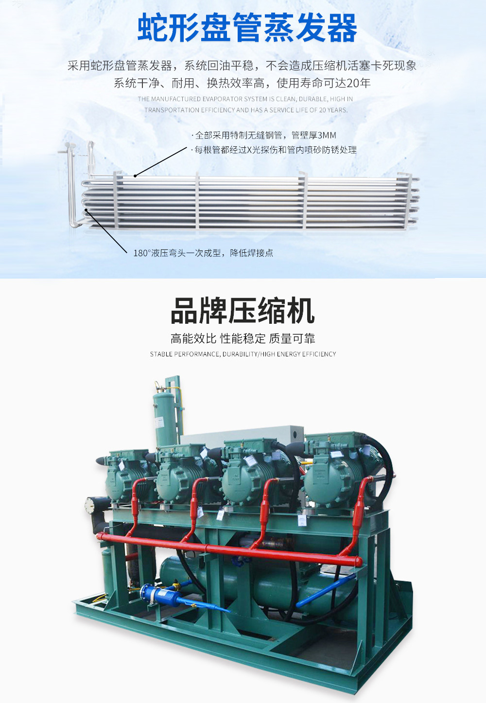 2、蛇形盤管蒸發(fā)器設(shè)計(jì),系統(tǒng)回油順暢,不會(huì)造成壓縮機(jī)活塞卡死現(xiàn)象。